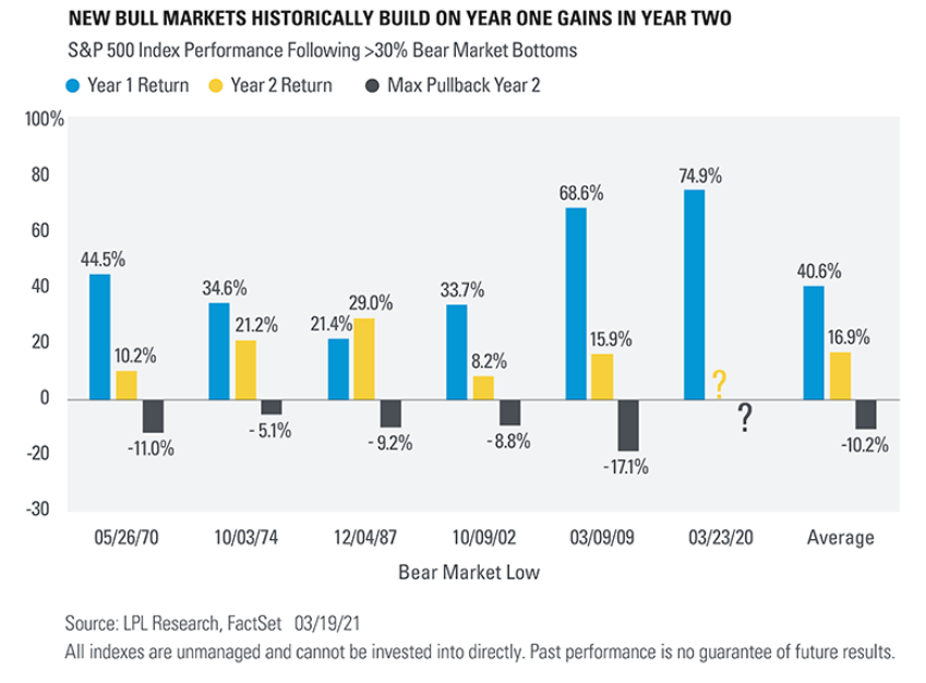 Since World War II, there have been six other bear-market sell-offs of at least 30%. In each case, the market posted strong returns in the first year, with an average gain of 40.6%. Gains ran into year two, with an average increase of 16.9%; however, the average pullback during those six periods: 10.2%.